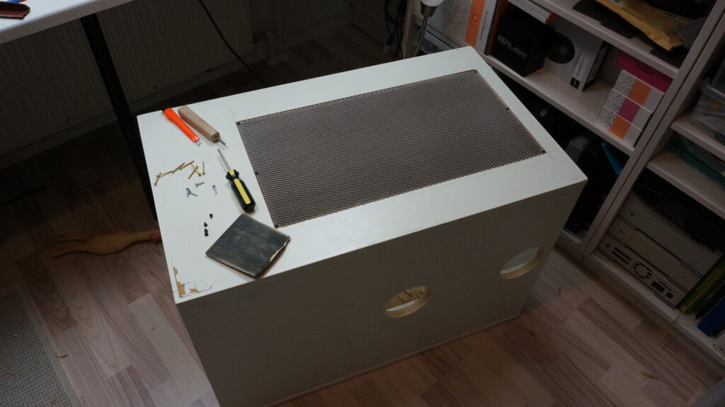 I added 2 holes to the wall side for cables and created big hole in the roof for radiators to exhaust all the heat. Little metallic mesh and looking like a case!