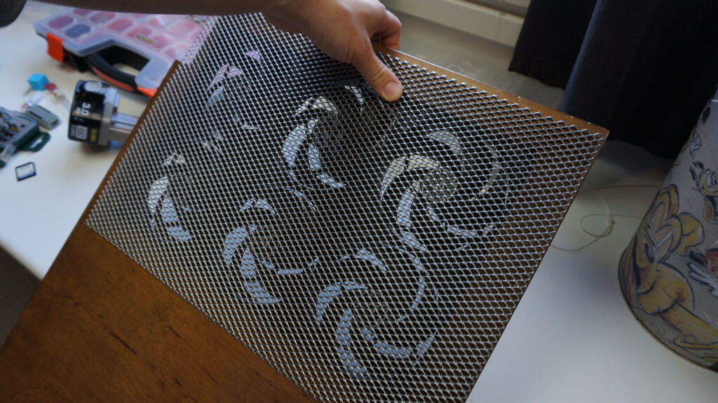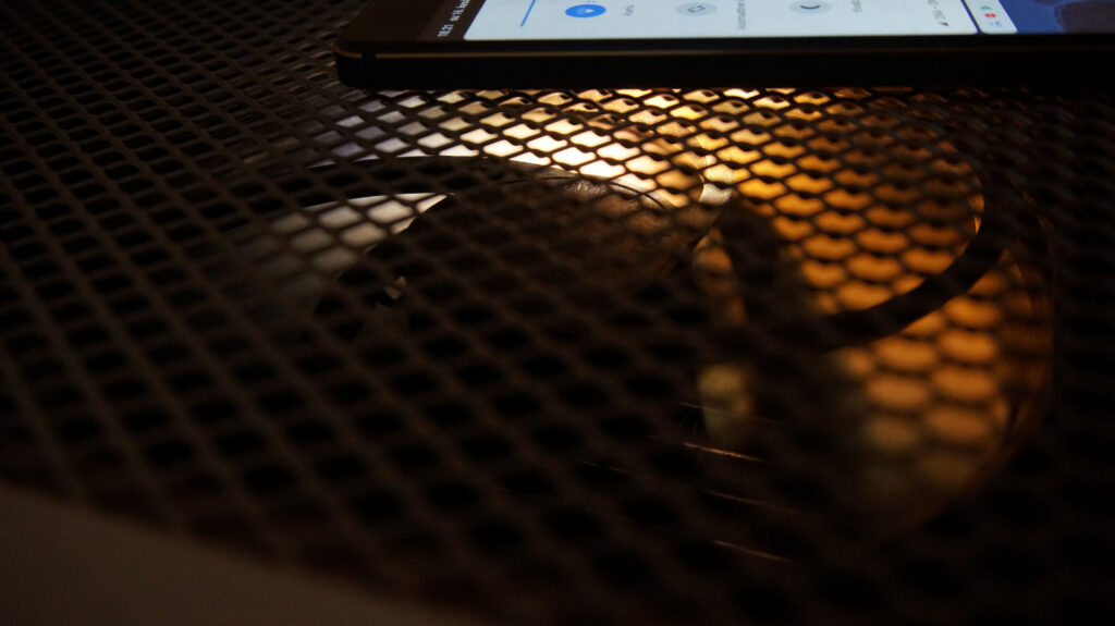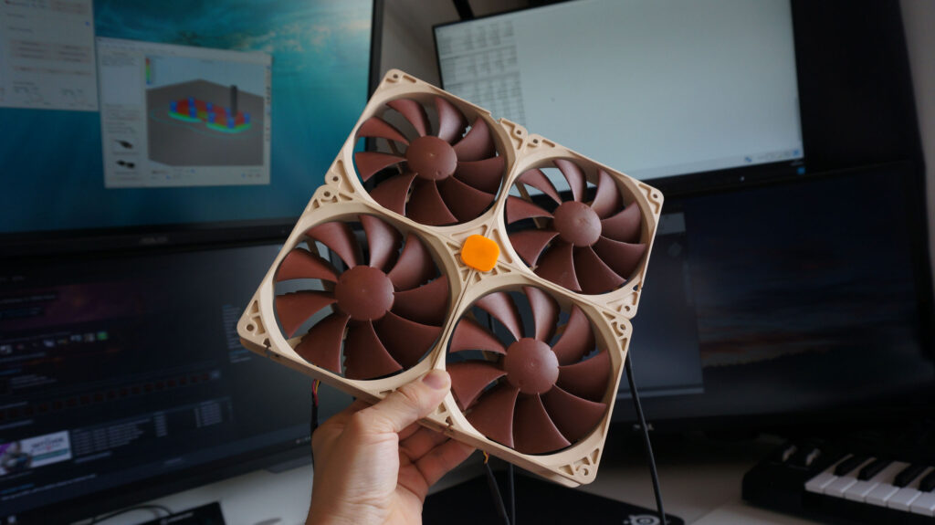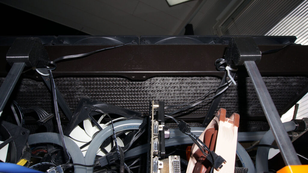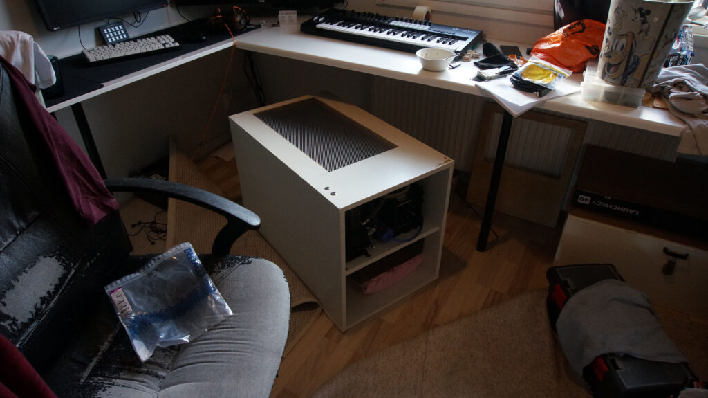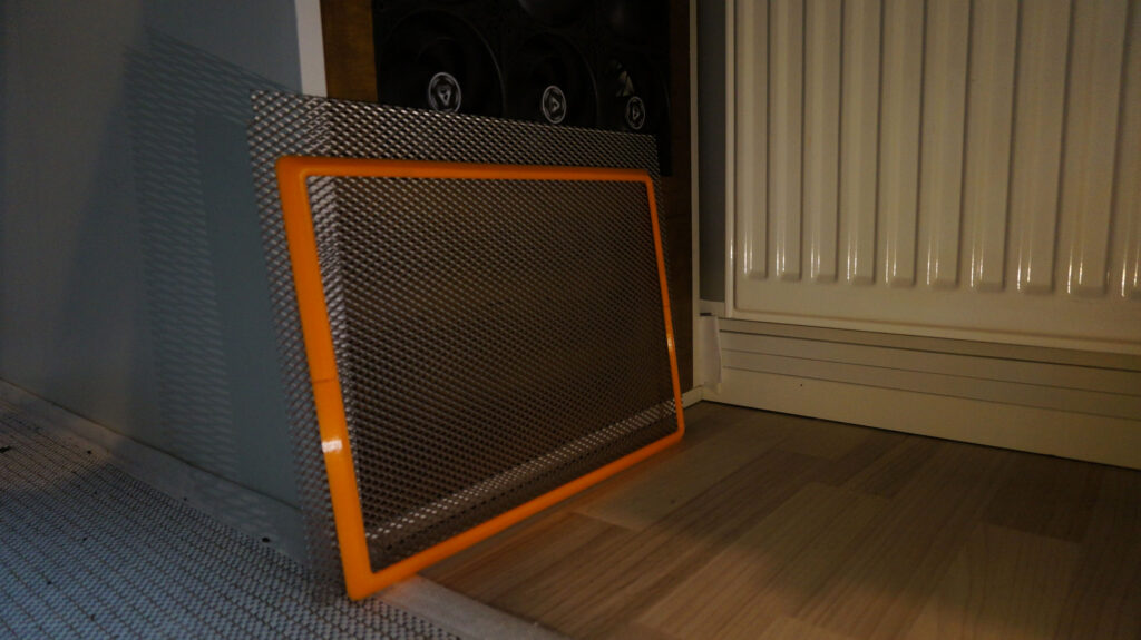 Collects a quite bit of dust due high volume of air moved even when all fans are on low speeds. Time to make fan filter to the front panel. Little more metallic mesh and 3D printed frame. I need to add magnets and some filter fabric and that’s done. I’ve just not done this yet..